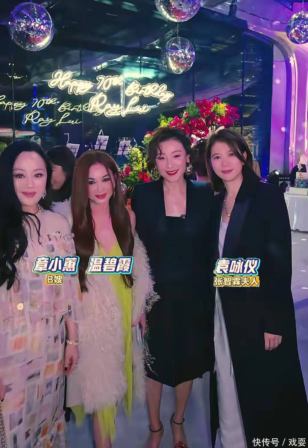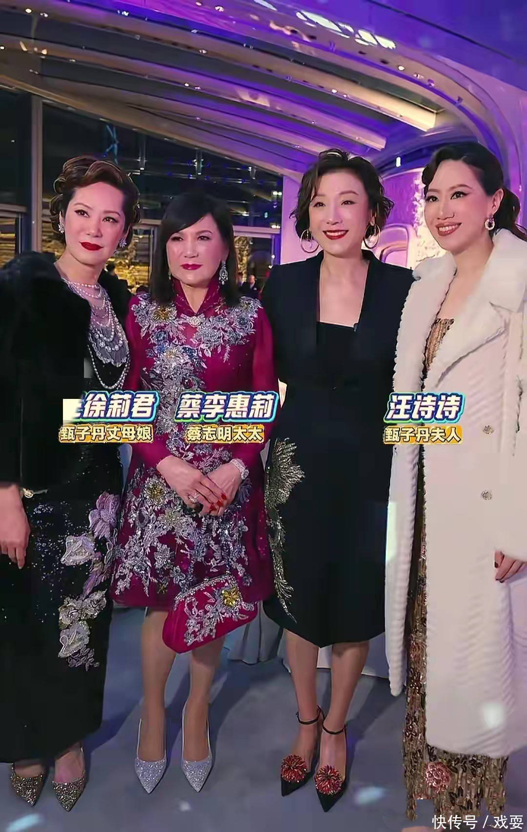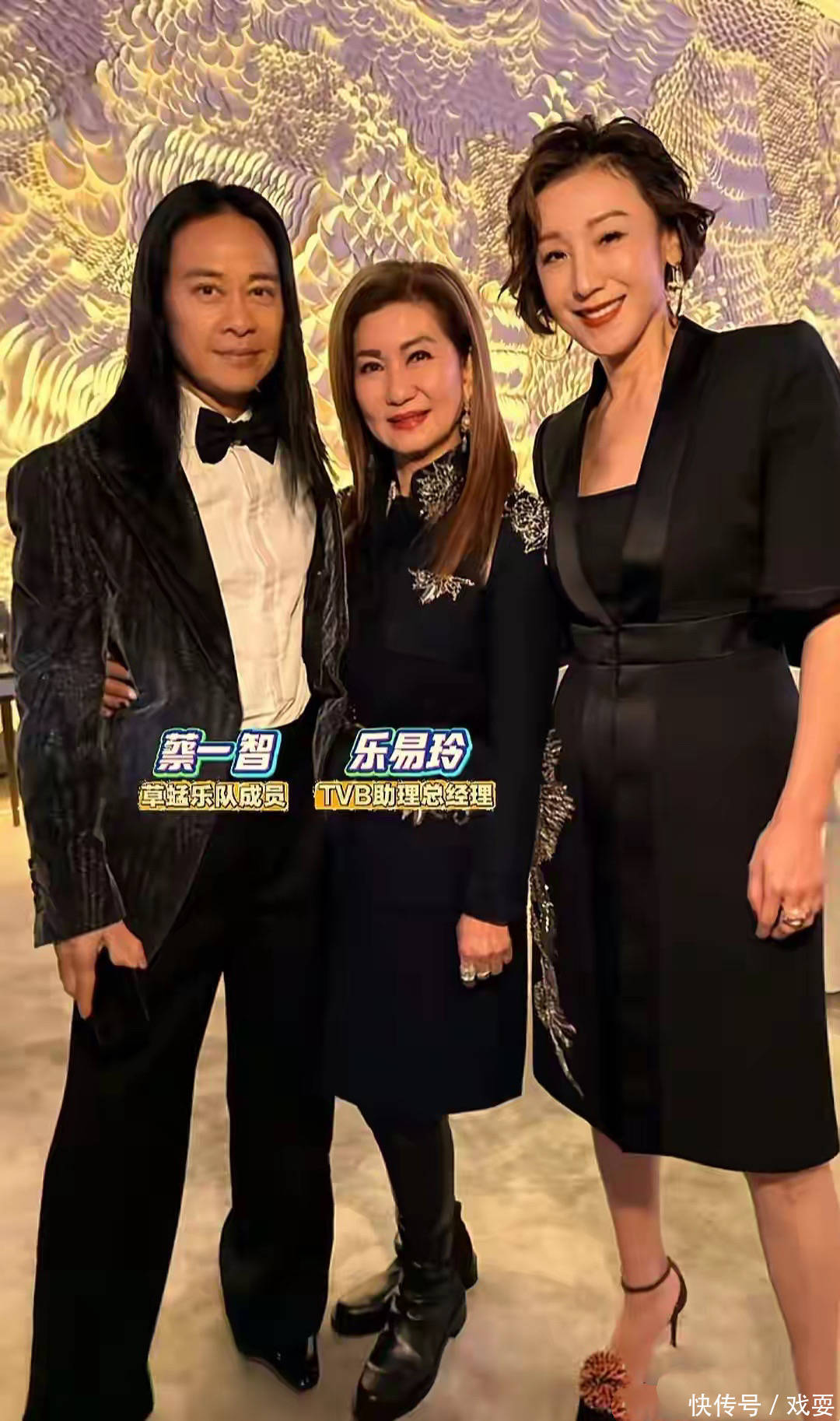 吕良伟夫人和袁咏仪、林静怡一起合影,袁咏仪穿着黑色长款风衣,内搭白色连衣裙,好优雅。