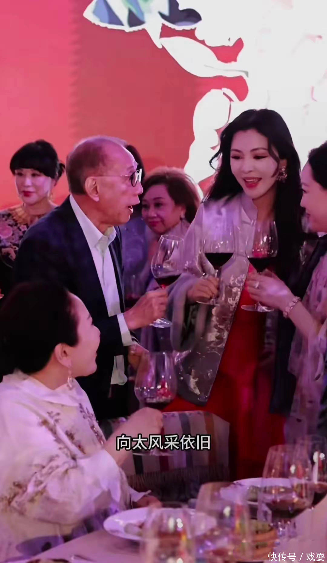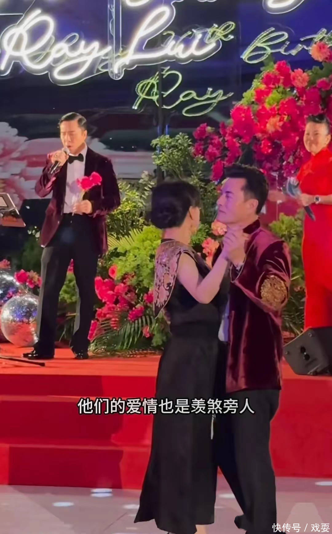 吕良伟和老婆一起跳舞,他穿着紫红色的中式服装,看起来非常年轻、说�岁都嫌多。老婆一身黑色旗袍,格外优雅。