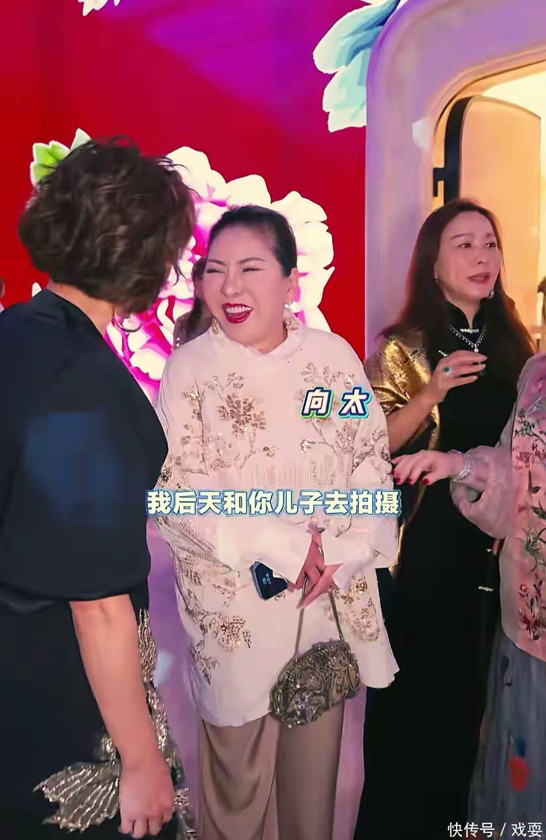 向太穿一身中式服装,把头发扎起来了,显得她脸大眼小,年纪大了、美貌再也比不上年轻时候。
